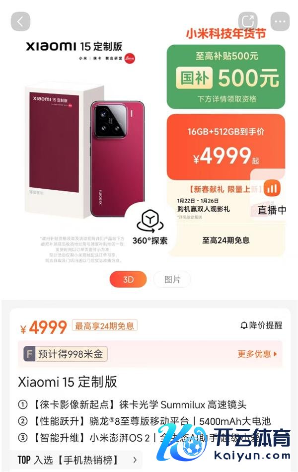 快科技 1 月 22 日音讯,本日世界杯体育,小米 15 定制版"新春献礼"配色开售,售价 4999 元(16GB+512GB),国度补贴优惠 500 元,平直 4499 元。