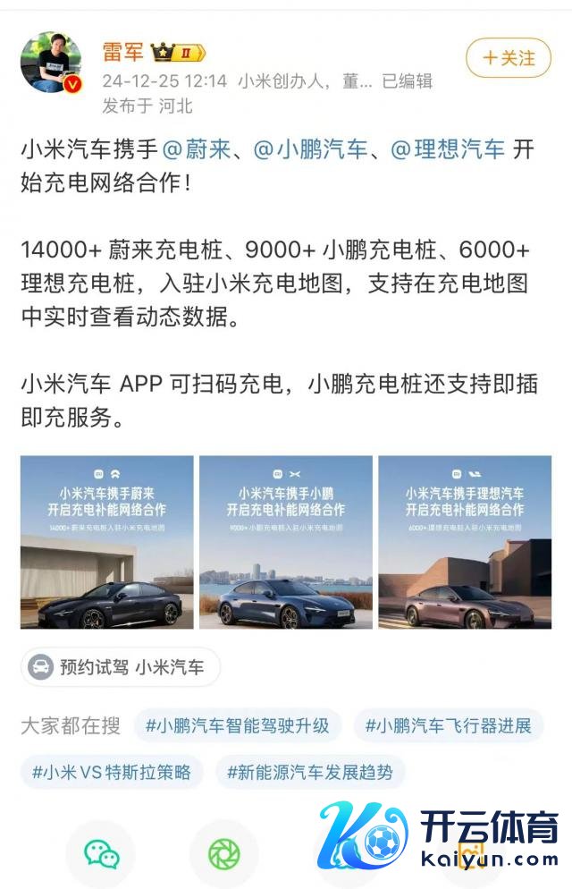 半年后的 2024 年 12 月 25 日,小米汽车官微发布讯息称,小米汽车说明与蔚来驱动充电补能麇集配合,14000+ 蔚来充电桩入驻小米充电舆图,复古在充电舆图中及时稽查蔚来充电场站的动态数据,同期复古小米汽车 App 扫码充电。