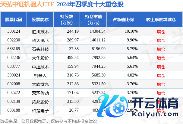 天弘中证机器东说念主ETF为指数型-股票基金,字据最新一期基金季报露馅,该基金金钱确立:股票占净值比99.86%,无债券类金钱,现款占净值比1.01%。基金十大重仓股如下: