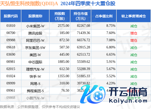 天弘恒生科技指数(QDII)A为指数型-国外股票基金,凭据最新一期基金季报泄露,该基金钞票确立:股票占净值比92.75%,无债券类钞票,现款占净值比7.05%。基金十大重仓股如下: